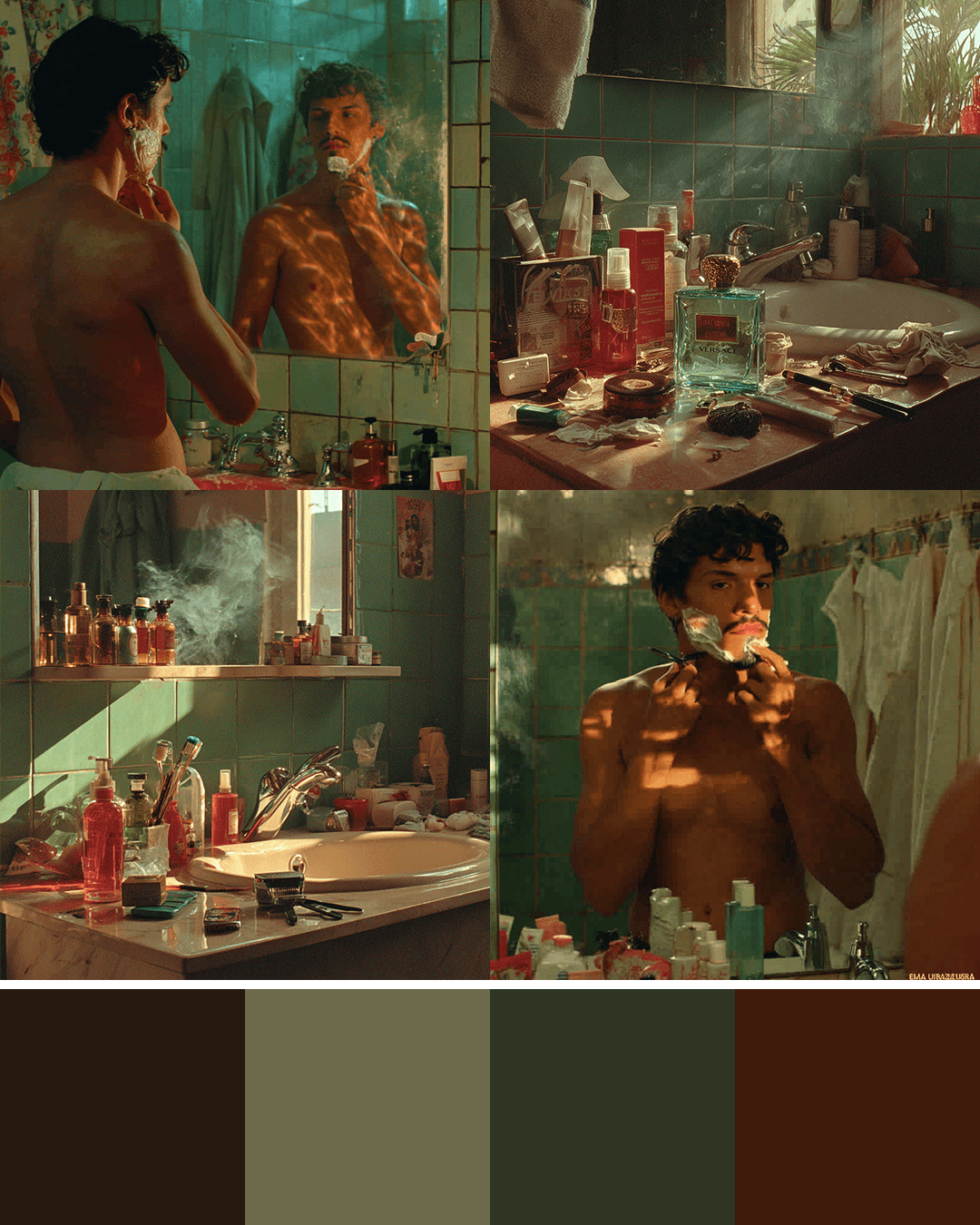 Close-ups on the sink, the razor, the cologne.