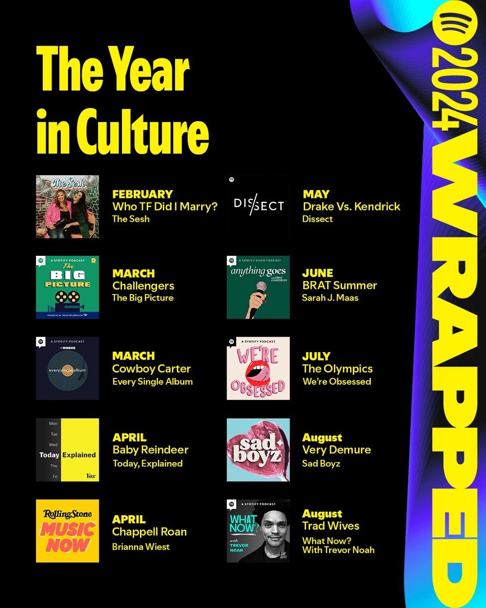 For Spotify Wrapped, I was in charge of leading the creation of assets, spotlighting top-performing podcasts and creators of the years.